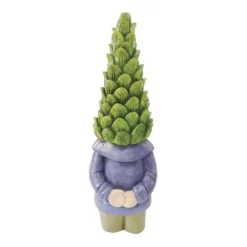 This gnome table decor is made of metal with a striped body and is holding a daisy. This can be used for both indoor and outdoor decoration.
