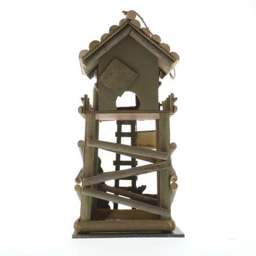Add a little rustic charm to the outdoors with this cute ranger station birdhouse. Birdhouse is decked out with pine trees, a tall ladder for climbing and a moose cutout. Clean out hole in back.
