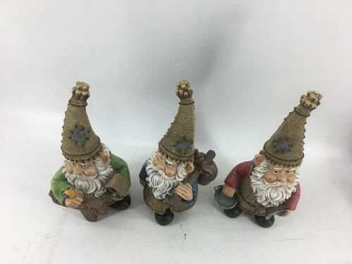 These beautifully crafter gnomes add some fun to your garden decorations. The hand-painted gnomes look like they are from the Old World in their rustic outfits. The burlap looking hats top off this great collection of three designs.