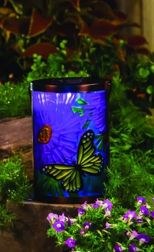 Light up your garden at night with this colorful solar lantern. With a unique blown glass front, this lantern features a painted decal design that glows from the internal light. The lantern housing is constructed from weather-resistant metal and features a hanging handle that can be attached to a hook, not included. Choose from Bluebird, Cardinal, Peacock, or Butterfly. Move indoors during harsh weather.