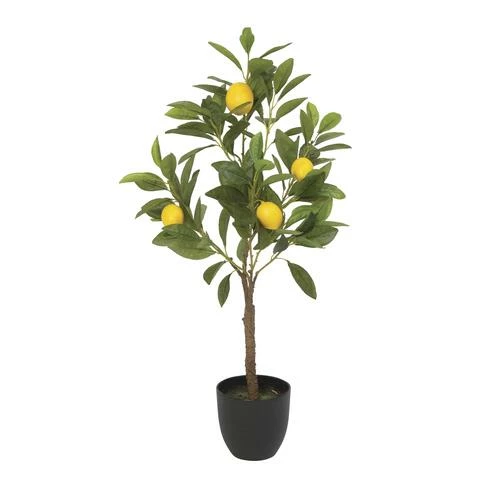 At 29″ tall, this lemon artificial tree features lush, smooth-edged green leaves that complement and surround the small bright yellow lemons nearly hidden in the foliage. Yellow and green paint a beautiful contrast that will highlight any space.