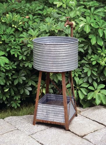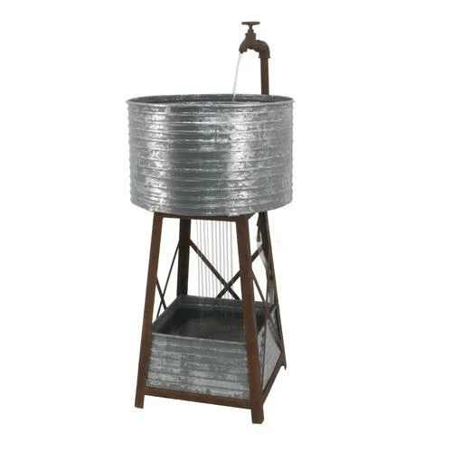 Enjoy a reminder from your visit to the country, with this endearing Apple Hill Water Fountain. At home in your front yard near a fruit tree, or nestled in some shrubbery by your back door ? this charming water element adds a touch of yesteryear to your garden oasis. Enjoy the soothing sounds of the water pouring into the basin, and the whimsy of the garden spigot streaming into the rustic corrugated basin below. The corrugated bin at the base can become a plant haven for a shade-loving fern or azalea. Add a feeling of Americana decor to your garden with this charming water fountain.