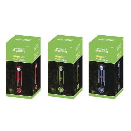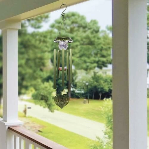 This hanging wind chime features a solar powered LED light and heart shaped spinner accent piece. Hanging height is 35″. Solar panel provides up to 8 hours of power on a full charge