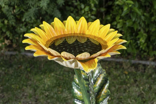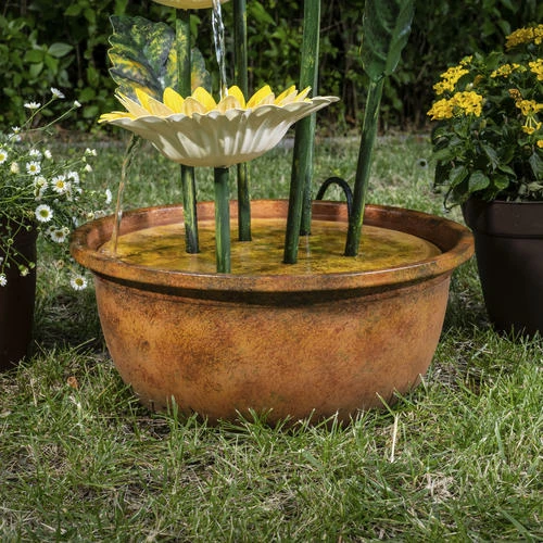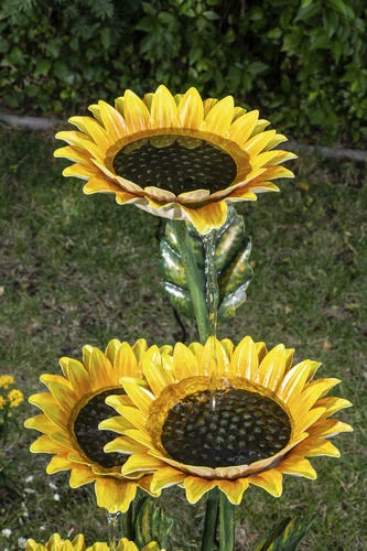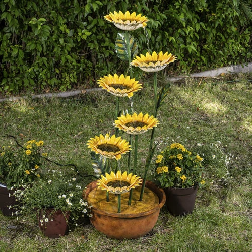 This cheerful beacon of sunshine will liven up your garden with its golden blooms and trickling water flow. Six tiers of sunflowers pass the water along gently, ultimately landing in the bottom basin. Enjoy the whimsy as you revel in the peaceful sounds that this fountain brings to your garden. Crafted from primarily galvanized steel, it will last many years if stored safe from frost during the harshest Winter weather.