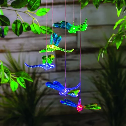 When the sun sets, your garden does not have to. The Dragonfly solar mobile features solar light. Your yard will light up at night when the sun goes down! This colorful design is perfect for your outdoor setting!! Move indoors during harsh weather. On a sunny day solar light can last up to 4-6 hours. Changes to 4 different colors: white, green, red, blue.