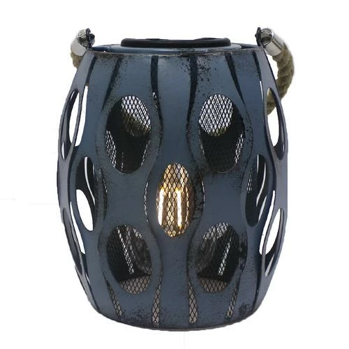 This blue solar lantern features a retro design and a rope handle. Oval in shape with a mesh insert, it’s the perfect accent for any space.