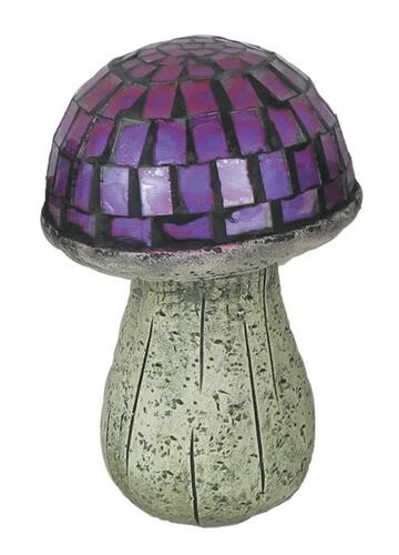 Add some sparkle to your garden with this eye-catching mosaic and cement mushroom garden decor, featuring a grey cement and purple colored mosaic glass. .When the sun shines on the top of the mushroom they will sparkle and add a magical touch of color to garden decor.