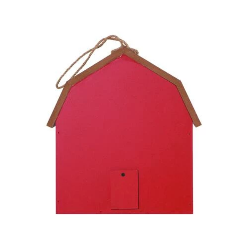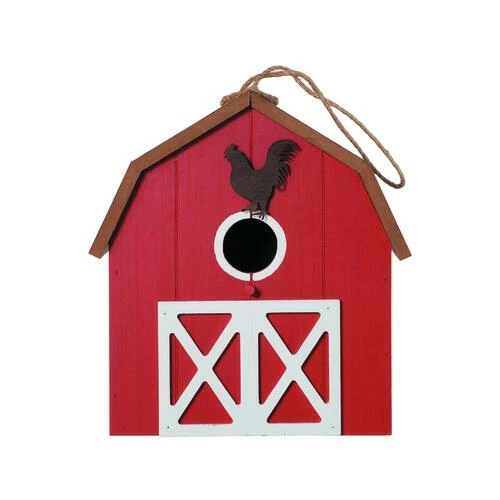 This red barn birdhouse is made of MDF, and decorated with white barn doors and a rooster. Product size: 8.75″LX5.5″WX9.5″H.