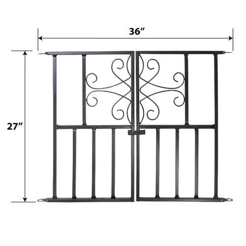 The Deluxe Scroll Gate works in union with the Scroll Fence System. Combine fence panels, end panel and posts then stake into the ground to support the fencing. The small metal hinge on one of the gate sections swings down, connecting to the other section for a latch. 27 inches high, this gate completes the perfect border to any yard or garden.