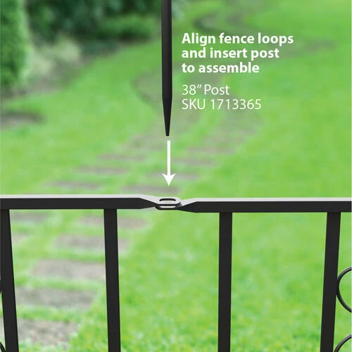 - Assemble using #1711425 fence sections, #1711427 end section and #1713365 38″ high posts