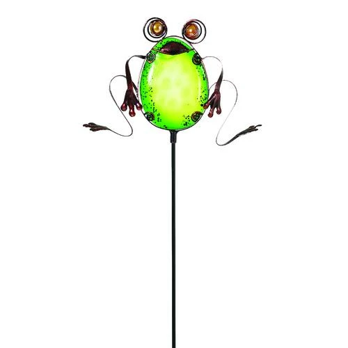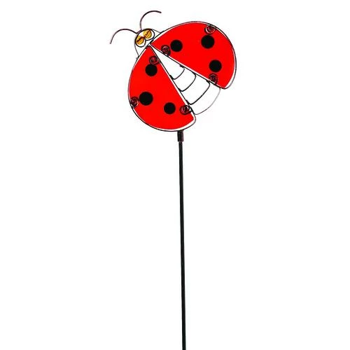 These eccentric plant stakes are sure to grab your neighbor?s eyes. They are accented with glass and metal. Choose from an assortment of 3. Features a frog, a lady bug, and a yellow snail. Made out of metal and glass. The colorful glass will shine in the sunlight!