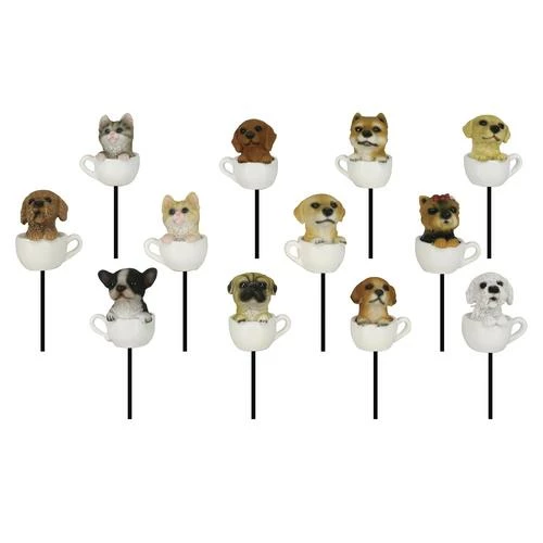 These cute little pets in teacups make wonderful accents to any potted plants. Features hand painted designs and metal stake. Available in a wide variety of breeds.